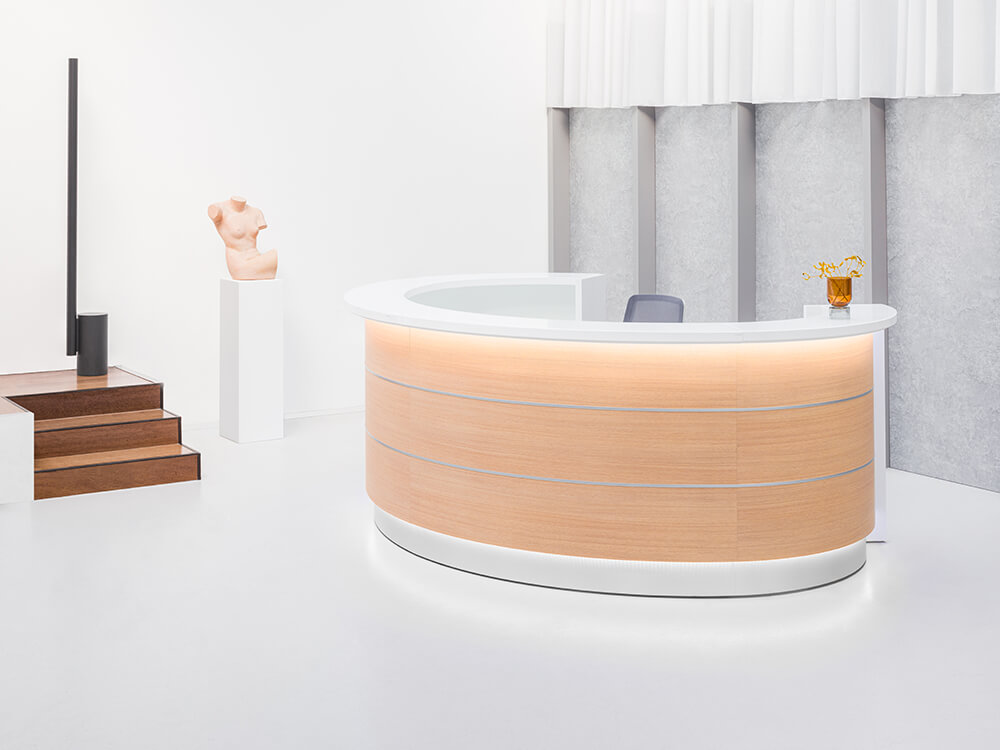 - LED illumination: At the full length of the reception desk, cold white color (verging on the blue shade)