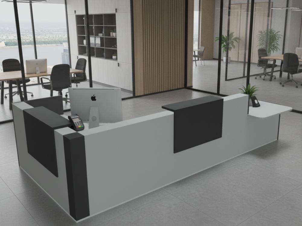 The Andreas 10 L - Shaped Reception Desk. A modern, inclusive reception desk with DDA-approved wheelchair access. Built from high-quality MFC with ABS edging, it features a durable 28 mm worktop, elegant glass and high-gloss HPL accents, and aluminium detailing. Equipped with cable grommets and a sturdy supporting leg, it offers modular sizing and a wide choice of finishes—perfect for contemporary office receptions