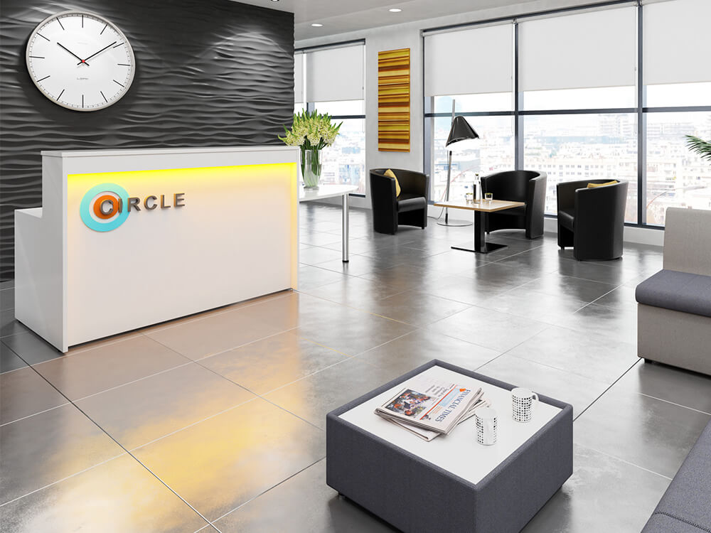 - D-End Extension: Universal left hand or right hand extension table with silver steel support leg that adds to the reception unit for a larger desk area