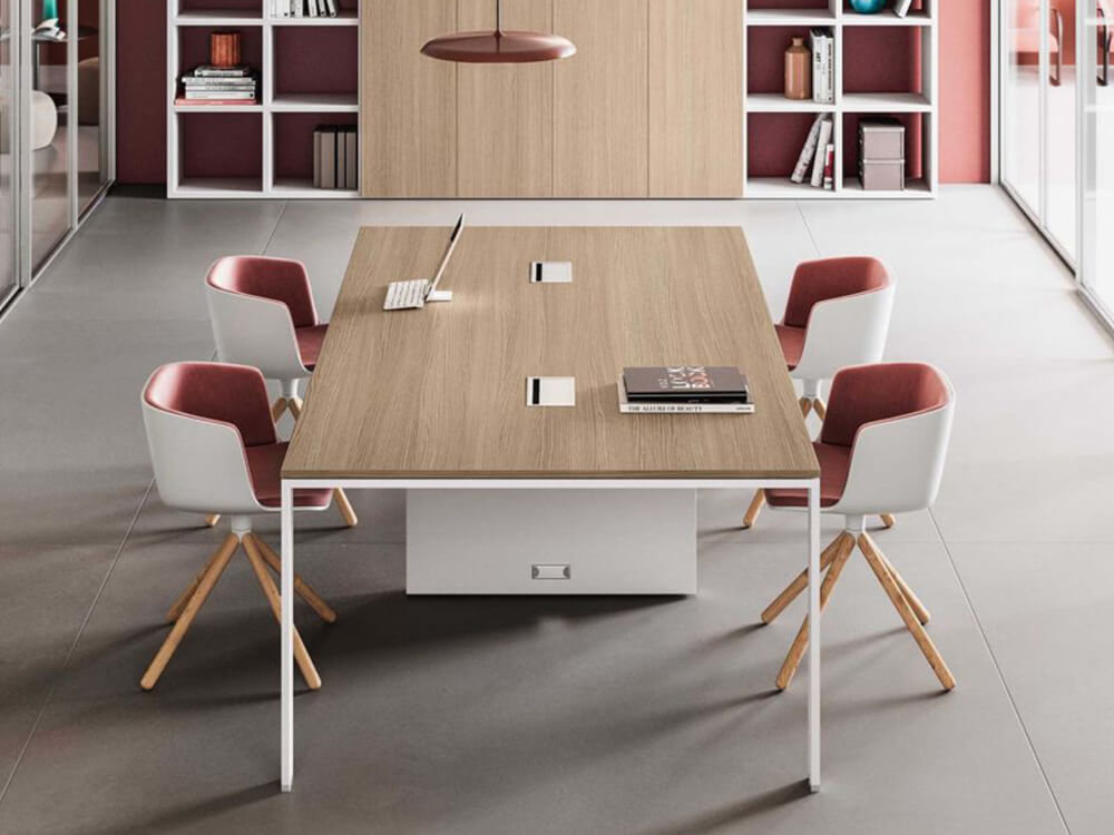 - Legs: Structure made of rectangular 70x20mm decapped steel tube th.1,5mm, epoxy powder painted. The legs are equipped with levelling feet in ABS. The central support leg for meeting tables is made of rectangular 70x20mm decapped steel tube th.1,5mm, epoxy powder painted. Included Central Panel Same As Leg Finish.