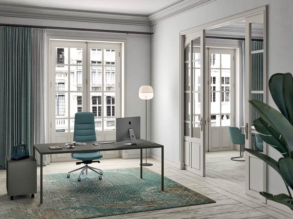 Slender metal or porcelain tops, thin metal tube legs, an optional pedestal and cable management adds to the elegant design of this Italian-made modern executive office desk.
