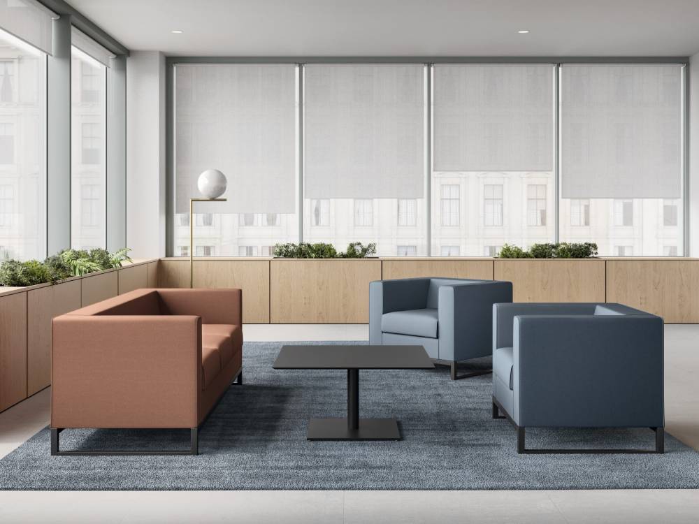 This soft furnishing suite has contemporary design written all over it. The straight sleek lines create a two-seater sofa, three-seater sofa and an armchair, all with the ability to be customised in the same or an array of leather and fabric chair shades. An interior designers dream, the deeply padded sofa suite modernises your office waiting room or breakout area, accompanied with Chrome ring leg frame.