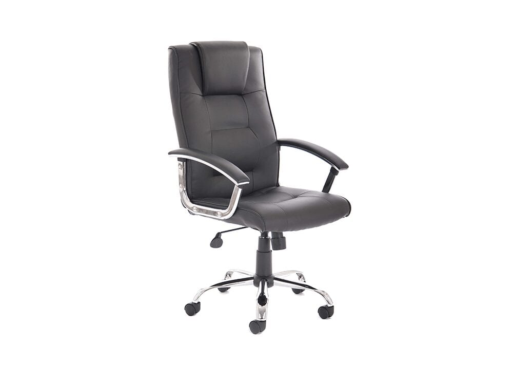 Sophistication is Bastian’s middle name, and this Black bonded leather executive chair will transform your office. Designed with Chrome detailing, the stunning upholstery design makes this executive chair with headrest an excellent choice for those long working hours. Crafted to keep you motivated all day, the padded arm rests and lockable executive chair gives that added element of luxury in just one furniture item. With a waterfall seat, the tilt mechanism allows the user to use the rocking mode for those creative thinking moments.