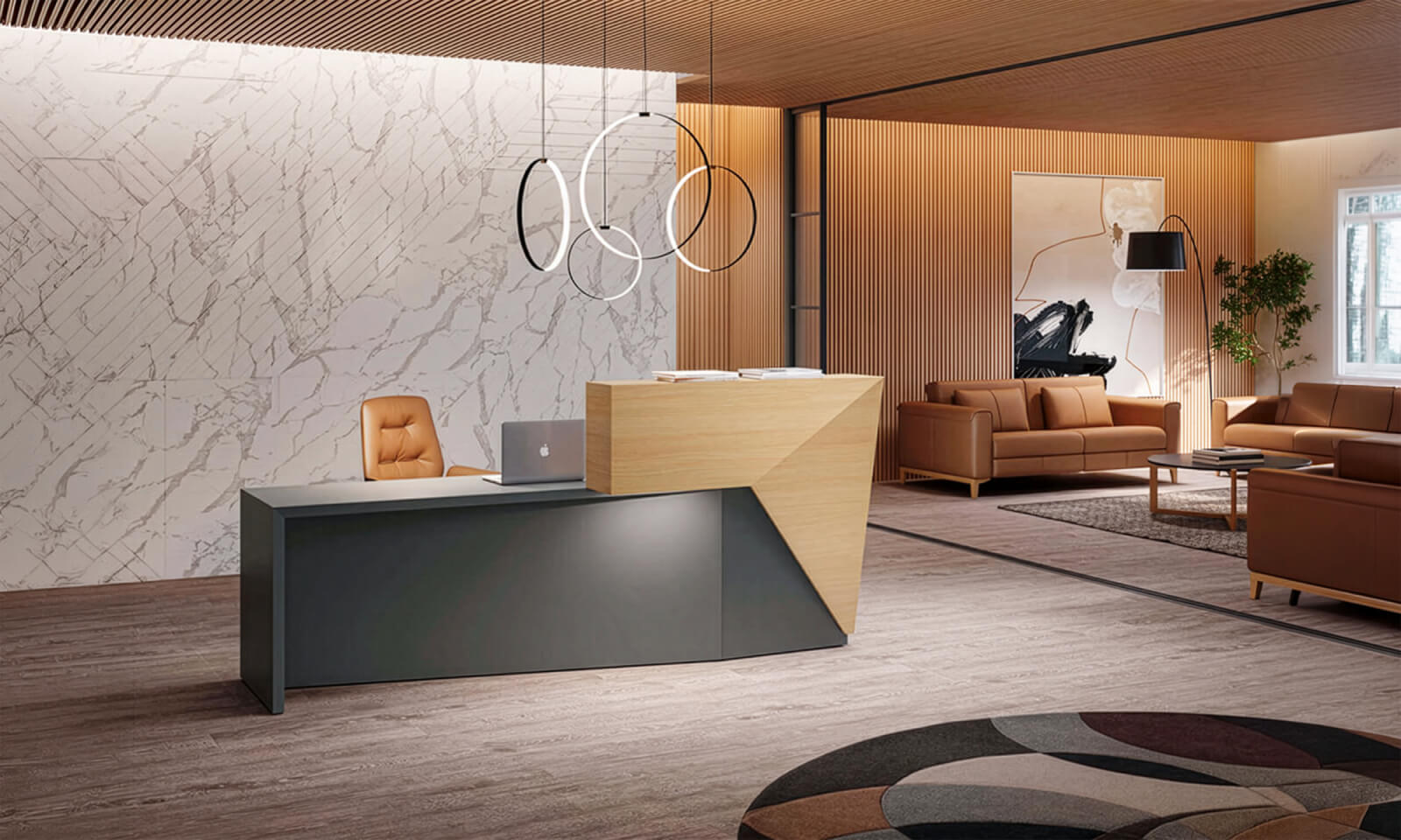 This approach supported smoother coordination between layout, circulation, and desk placement, resulting in reception areas that functioned efficiently without appearing constrained by compliance requirements.