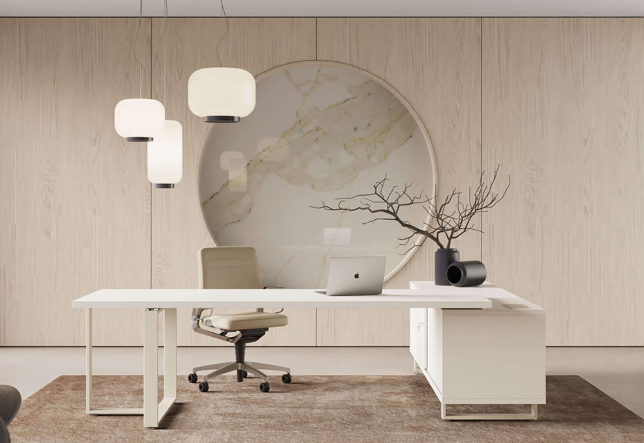Winter whites, combined with layered neutral tones like beige, taupe, and cream, evoke a sense of calm and purity. This timeless palette brightens up the space during the gloomy winter months. Office chairs with white fabric or light-toned wooden finishes can be paired with neutral rugs, curtains, and throws for a serene yet stylish environment. The layered approach adds depth, creating a visually appealing and inviting space.