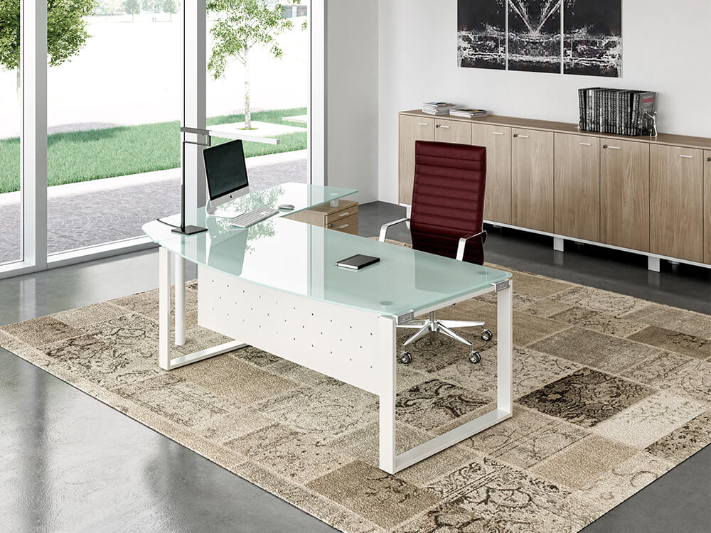 Bonnie 1 is an Italian designed formal glass executive desk with metal ring legs. Connect an optional return supported on a combination unit either to the left or right side of the desk. Conceal your wires through cable management trays and cable spines, creating an uncluttered workspace.