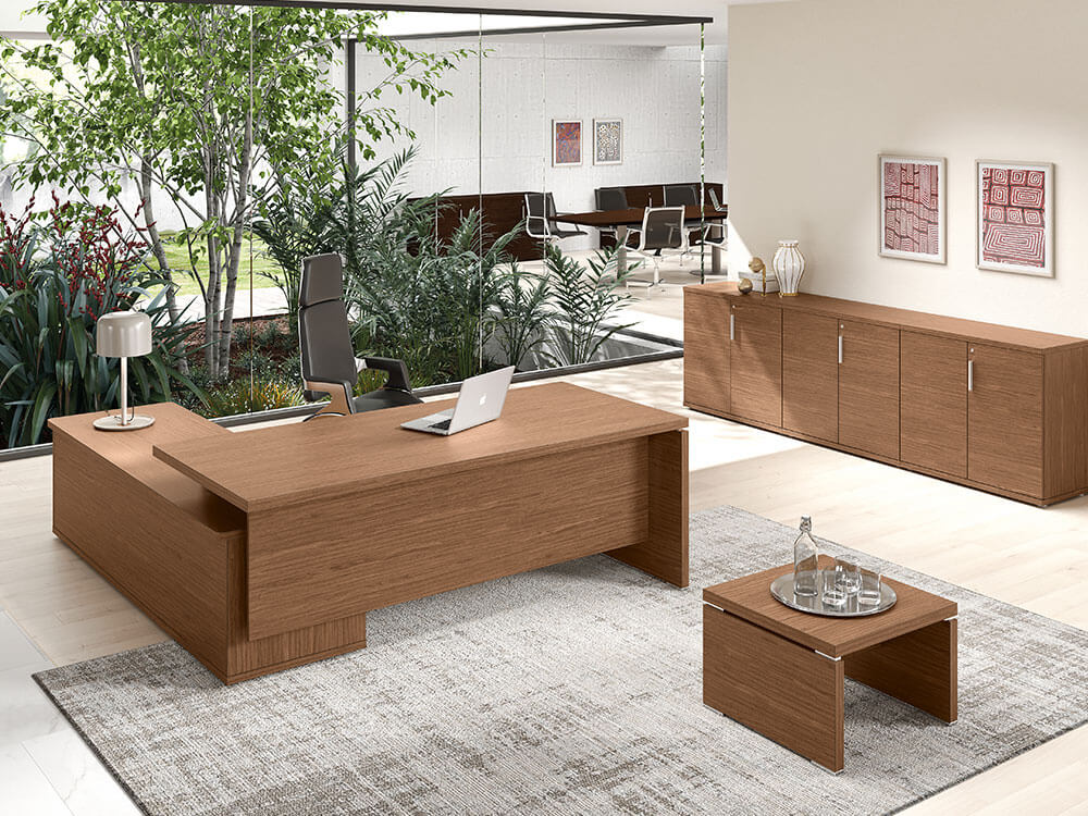 With Bravvo, you can have classic and modern in your office. Finished in Italian melamine/wood veneer, this executive desk features panel legs and either a return unit or credenza unit. Cable management features include top access, cable tray and cable spine.