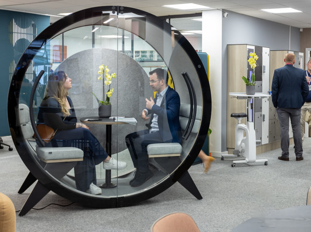 - Pod: Acoustic furniture accommodating 4 or 6 people with backwall options. Features a Formica color-matched laminate frame and table, dimmable LED light, two USB-A and USB-C ports, plus a power socket beneath both seats and adjustable backrests. The exterior and interior walls are made from 100% recyclable natural wool.
