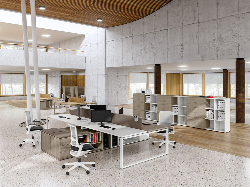 - Worktop: Desks feature a 2 mm thick x 70x30 mm electro welded metal section leg with a rectangular outer section. The top is a 30 mm melamine-faced panel edged in 2 mm ABS. The top and leg are joined by 200 mm steel brackets fixed to metal inserts incorporated into the top.