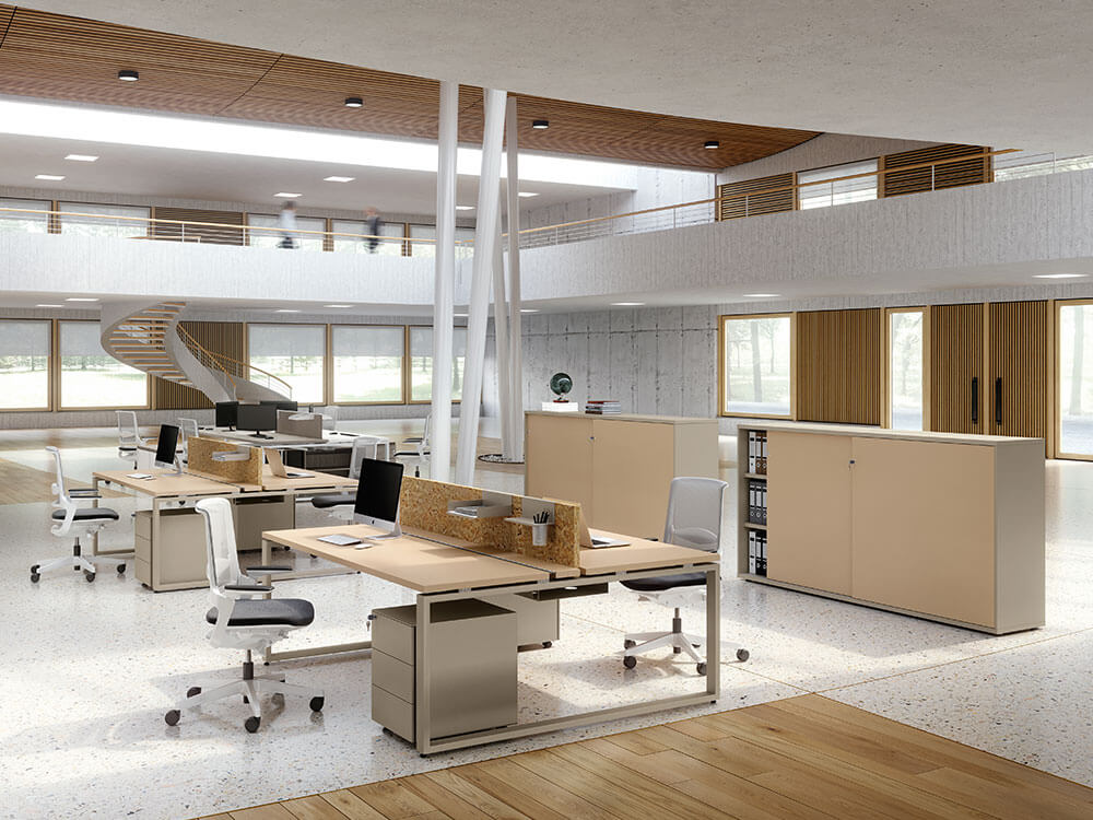 - Worktop: Desks feature a 2 mm thick x 70x30 mm electro welded metal section leg with a rectangular outer section. The top is a 30 mm melamine-faced panel edged in 2 mm ABS. The top and leg are joined by 200 mm steel brackets fixed to metal inserts incorporated into the top.