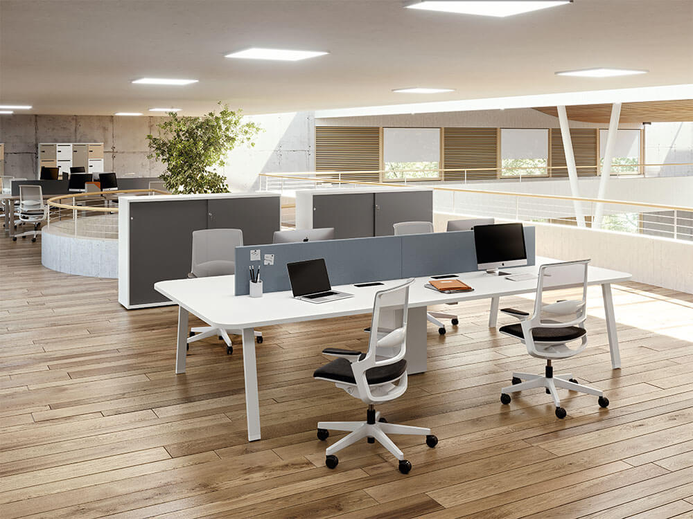 - Worktop: Desks feature a 2 mm thick x 70x30 mm electro welded metal section leg with a rectangular outer section. The top is a 30 mm melamine-faced panel edged in 2 mm ABS. The top and leg are joined by 200 mm steel brackets fixed to metal inserts incorporated into the top.