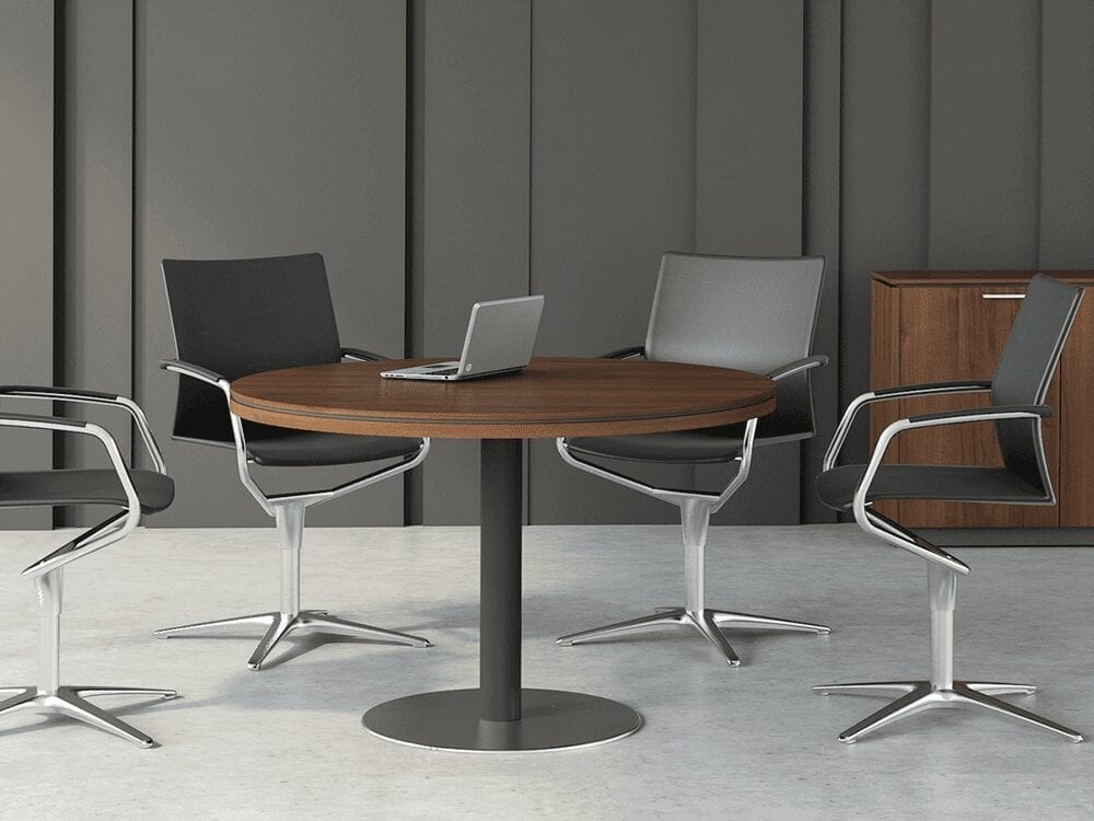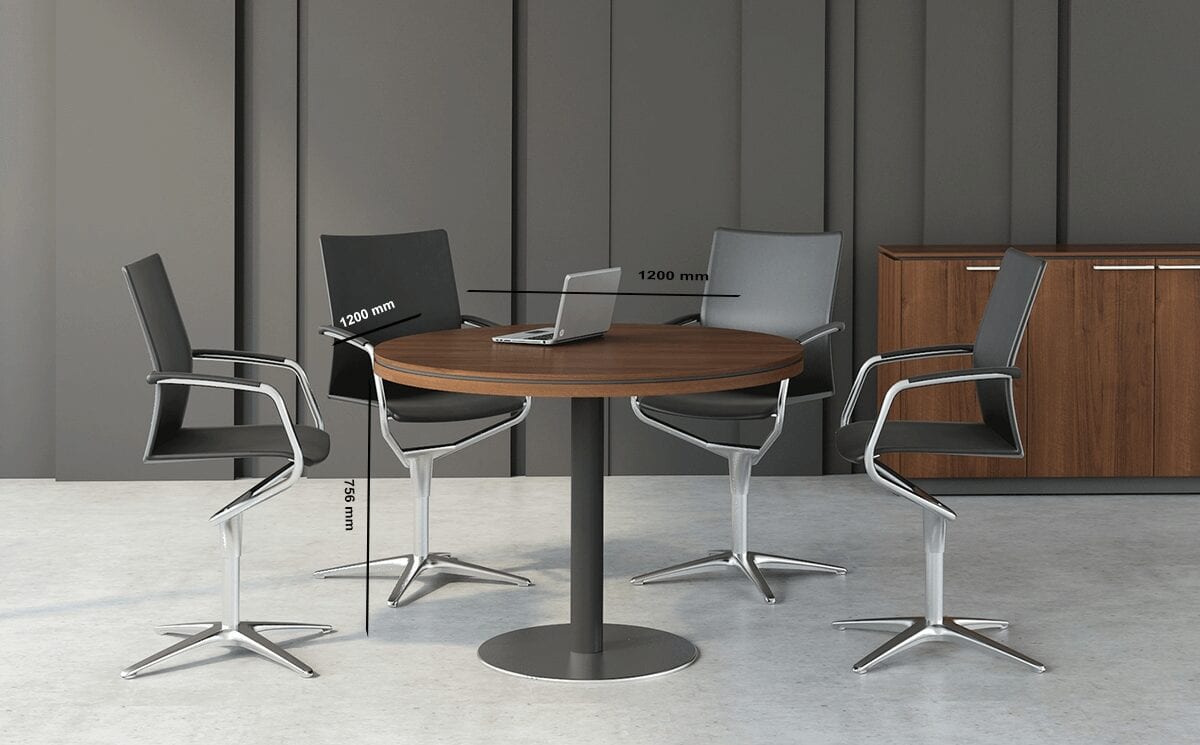 Choosing a Round shaped meeting room table allows you to maximise meeting space while having a design that is out of the ordinary. The smooth curves of this office boardroom desk are finished in one of three decorative woods, which are Canadian Oak, Chestnut, and Lowland Nut. The worktop finish is broken up by a 12mm thickening element of anthracite shade for an industrial edge to match the slab legs of our boardroom conference desk.