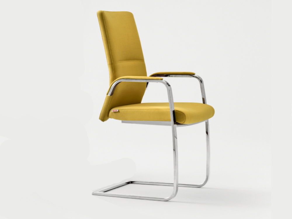 The backrest is available in smooth padding or with a pleated finish. The polished aluminium armrests with upholstered pads allow the chair’s synchronized movement.