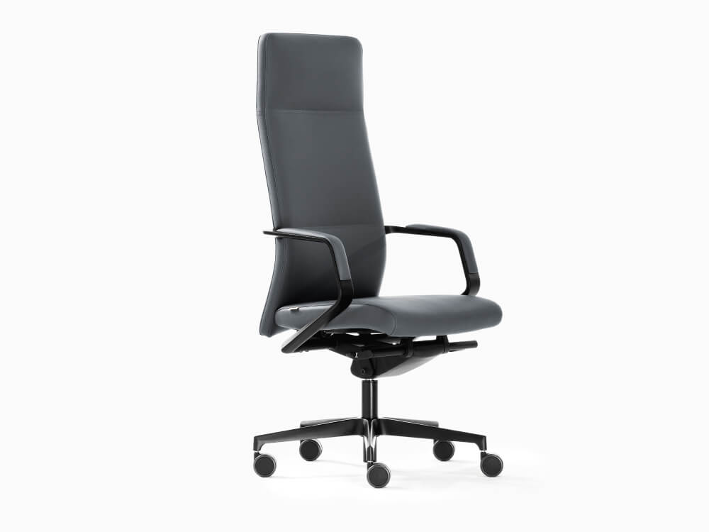 The backrest is available in smooth padding or with a pleated finish. The polished aluminium armrests with upholstered pads allow the chair’s synchronized movement.