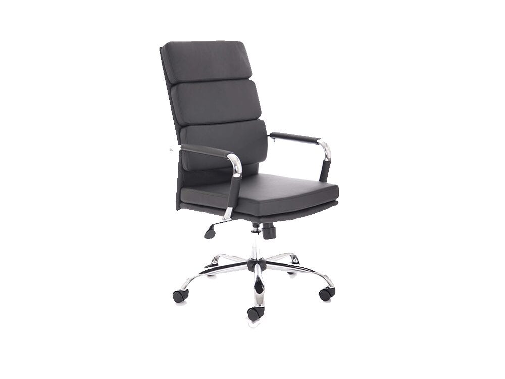 Created on top of a solid Chrome frame, take your pick of our Black bonded leather executive chair. Excellent for any modern or classic office environment, the clean lines of Emerson will help you feel agile. The large padded square seat highlights the three padded back rests that contour your body, plus as an executive chair with armrests, sit back and relax for long-lasting comfort. This high back executive chair comes with a lockable tilt mechanism to bespoke the chair to your needs.