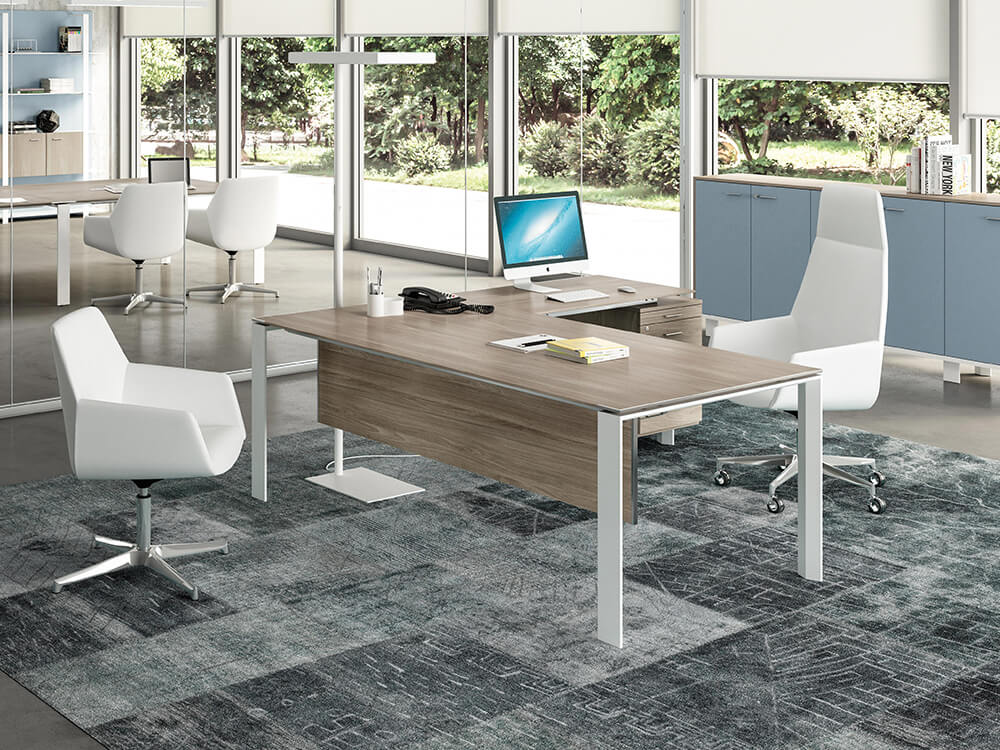 Enrique 2 is a modern executive desk featuring goalpost leg frames and manufactured from epoxy powder coated or chromed steel. The desk is made from a 18 mm thick top with chamfered edges available in four Italian melamine finishes. Add a combination unit supporting the return top and manage your wires through a variety of cable management.