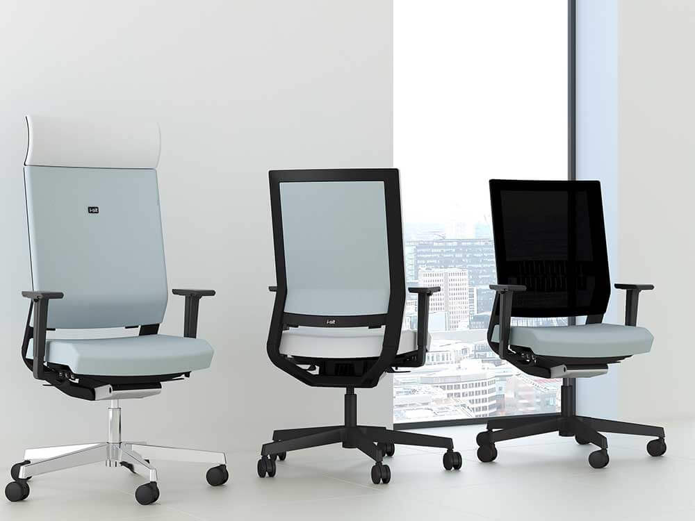 - Upholstered or mesh back, Ergonomic synchronous mechanism.