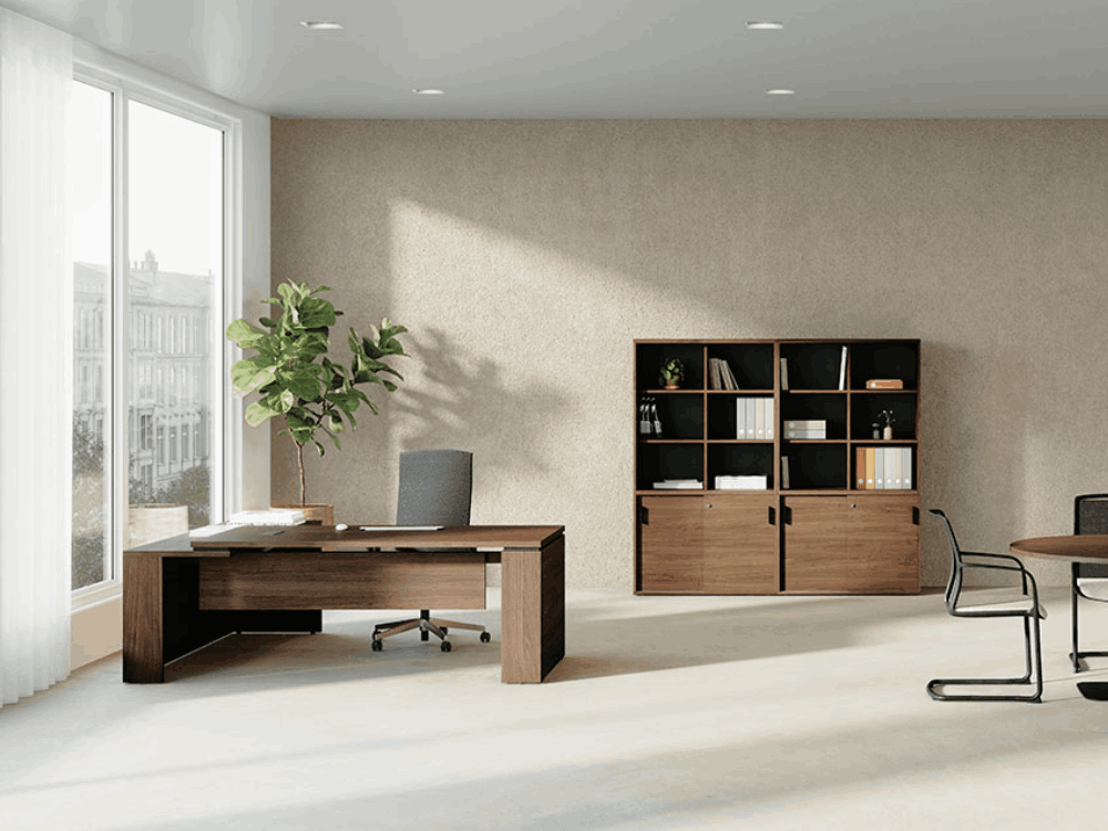 Geno 3 is a timeless executive design that stands out thanks to its great thickness of worktop and panel leg. A return can be added to increase the work surface or a pedestal can be added to store your belongings. A selection of three different melamine finishes, wire management trays and cable spines create an uncluttered workspace, making it an excellent choice for managerial and executive offices.