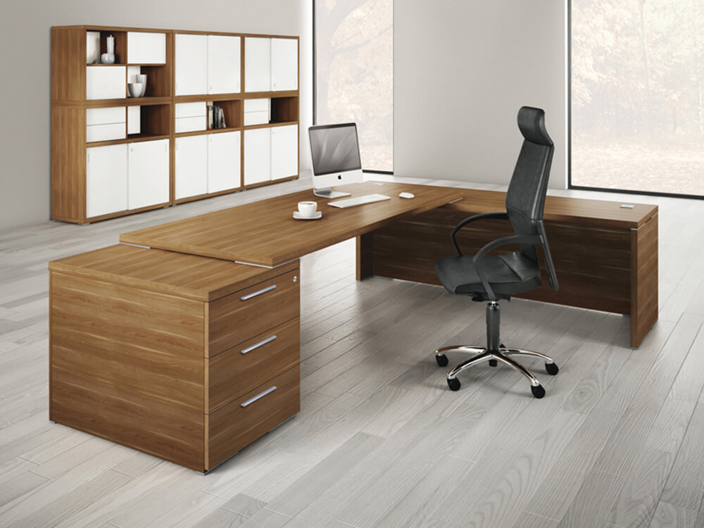 Geno is a timeless executive design that stands out thanks to its great thickness of worktop and panel leg. A return can be added to increase the work surface or a pedestal can be added to store your belongings. A selection of three different melamine finishes, wire management trays and cable spines create an uncluttered workspace, making it an excellent choice for managerial and executive offices.