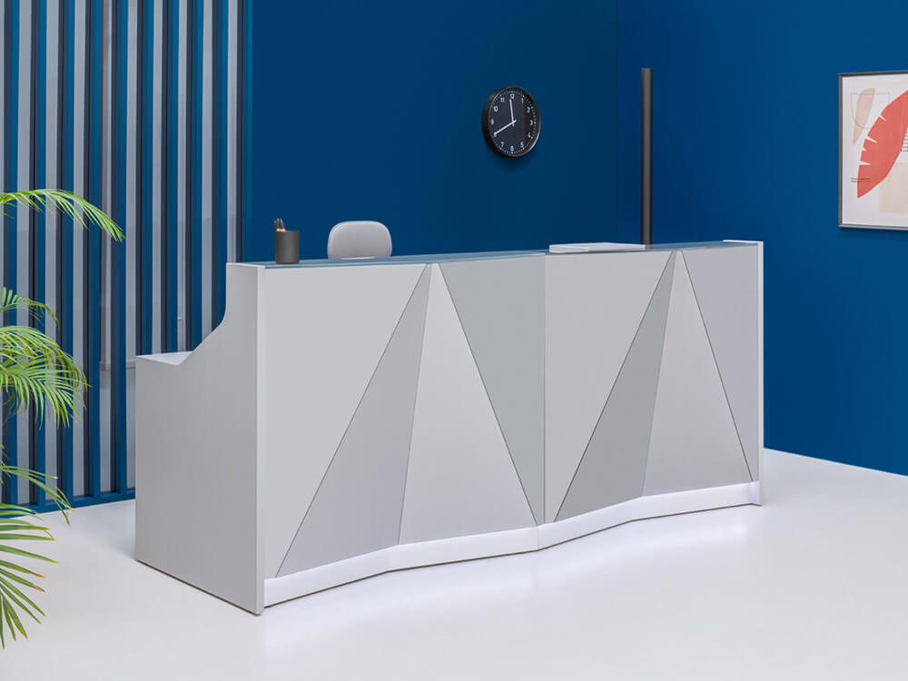 When it comes to Gia, money can definitely buy happiness. Our modern reception desk will make dreams come true to take centre-stage, being simultaneously luxurious and simplistic, catch the eyes of your visitors with a high-gloss finish. Ready in Black, Silver or White, a contemporary reception desk with LED illuminated lights is perfect for hospitality, fashion, publishing or any creative field. Available in a variety of sizes, no matter which one you pick, the workspace can be organised to perfection.