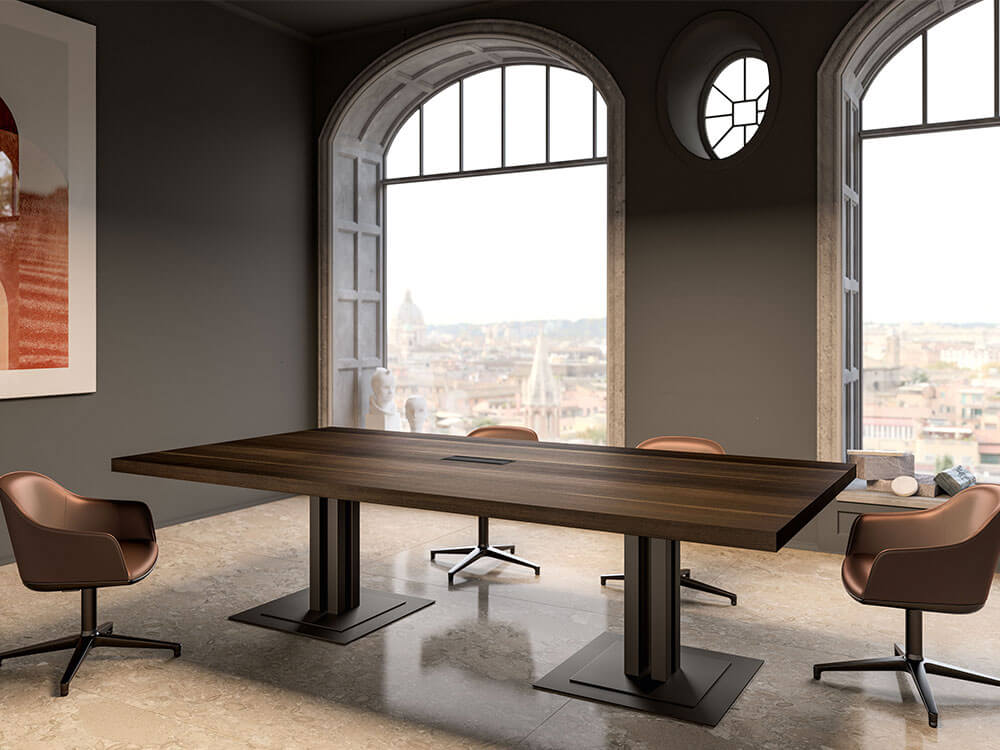 - Worktop:The meeting table, with its accentuated longitudinal development, dominates the environment with plays of volumes and contrasting finishes.