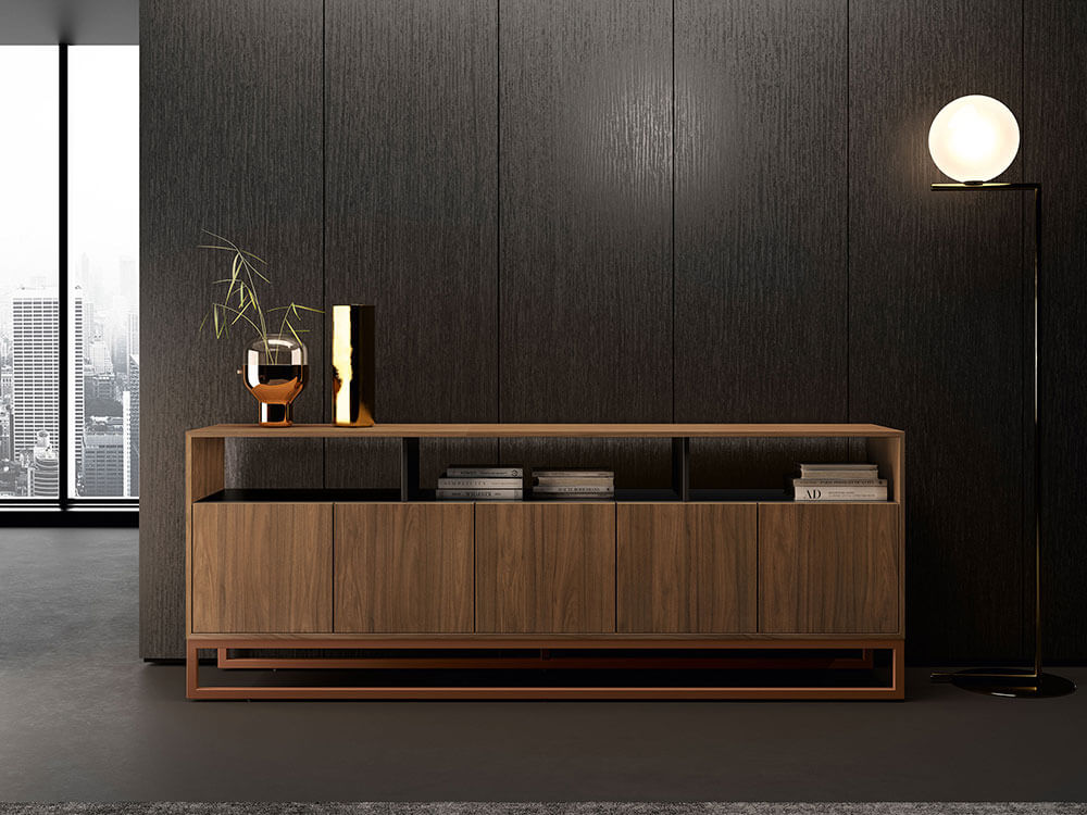 - Top, Base And Side Panels: Elements that create the shell of the sideboard and that are joined to each other by 45° junction. Made with 18mm thick particle board panels in 2 versions:E1 class scratch-resistant and anti-reflective melamine on two sides, with 1mm thick ABS perimeter edges, in 2 finishes. Scratch-resistant matt lacquer with polyurethane paints.