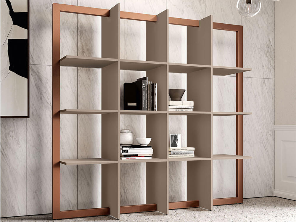 - Bookcase Structure :pickled steel sheet, 1.5mm thick, epoxy powder coated. Consisting of 2 “C” side elements and linear central elements. The frame is designed for the fixing of vertical dividers and side shelves