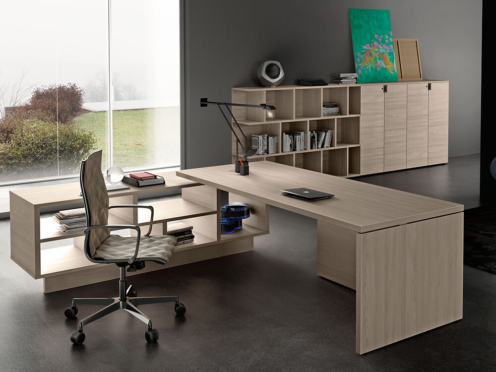Incorporating elegance into the workplace, this grand executive desk is designed by Paolo Pampanoni. The desk is constructed from 40 mm thick melamine material and comes in four different colour options. You can add a wide open service element with five small and one large compartment, along with a cable management system.