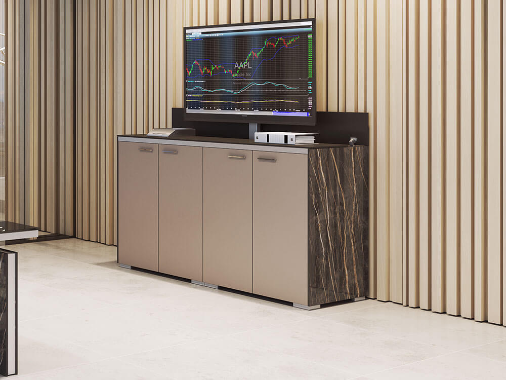 - Equipment: Showcase with extra space for a TV set behind the storage space Equipped with a column with electric height adjustment, TV mounting bracket and a remote control for operating the column, power cord approx. 1.5 m with Schuko plug. Max. dimensions of the TV set - 65”. The TV set is not included. One remote control can operate a TV cabinet.