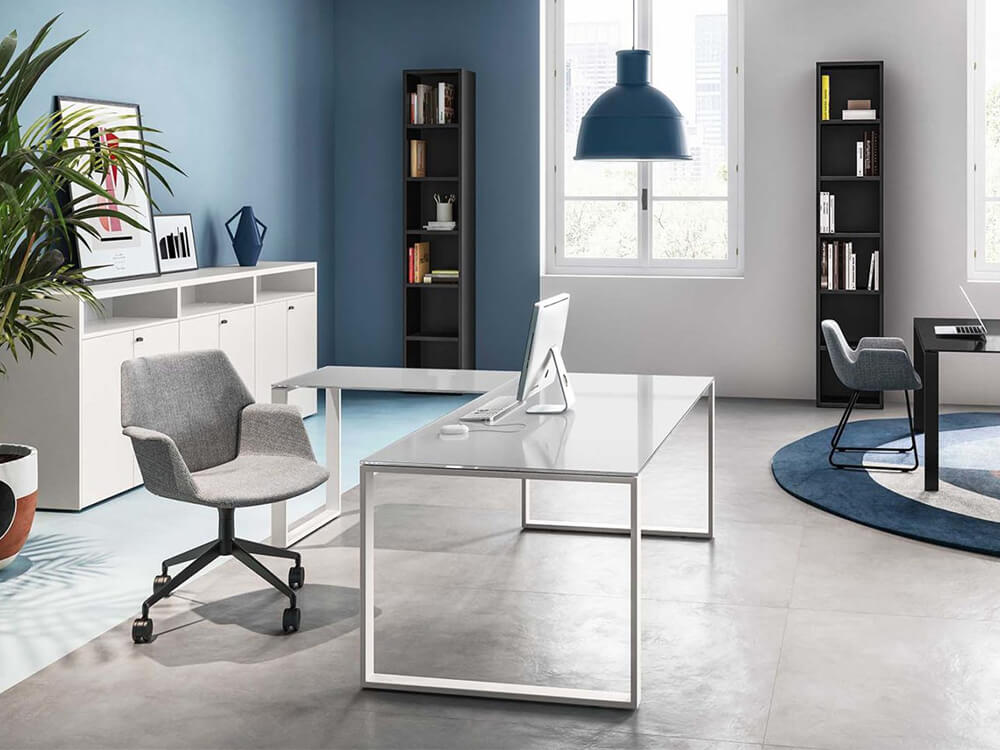 Our star player Gus proposes undoubtable chic, formed as a tinted toughened glass executive desk. With one of our three coloured steel ring legs, match your choice perfectly with ten stunning finishes of Smart Black, Marsala, Mud Grey, and many more. This contemporary ring leg executive desk is sure to keep productivity high as they will not want to keep their eyes off it. Like a balancing act, these elements are seamlessly joined for a minimalistic style for your office.
