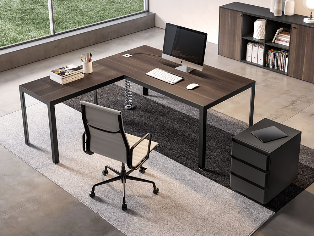 The Harvey executive desk boasts a minimalistic design, exuding modernity and chic aesthetics. It is available in seven wood veneer finishes, complemented by an aluminum structure. Additionally, you have the option to include a return or credenza unit that seamlessly attaches to the desk. Complete the ensemble by matching the desk with a 2 or 3 drawer pedestal and ensuring a tidy workspace with the inclusion of cable management.