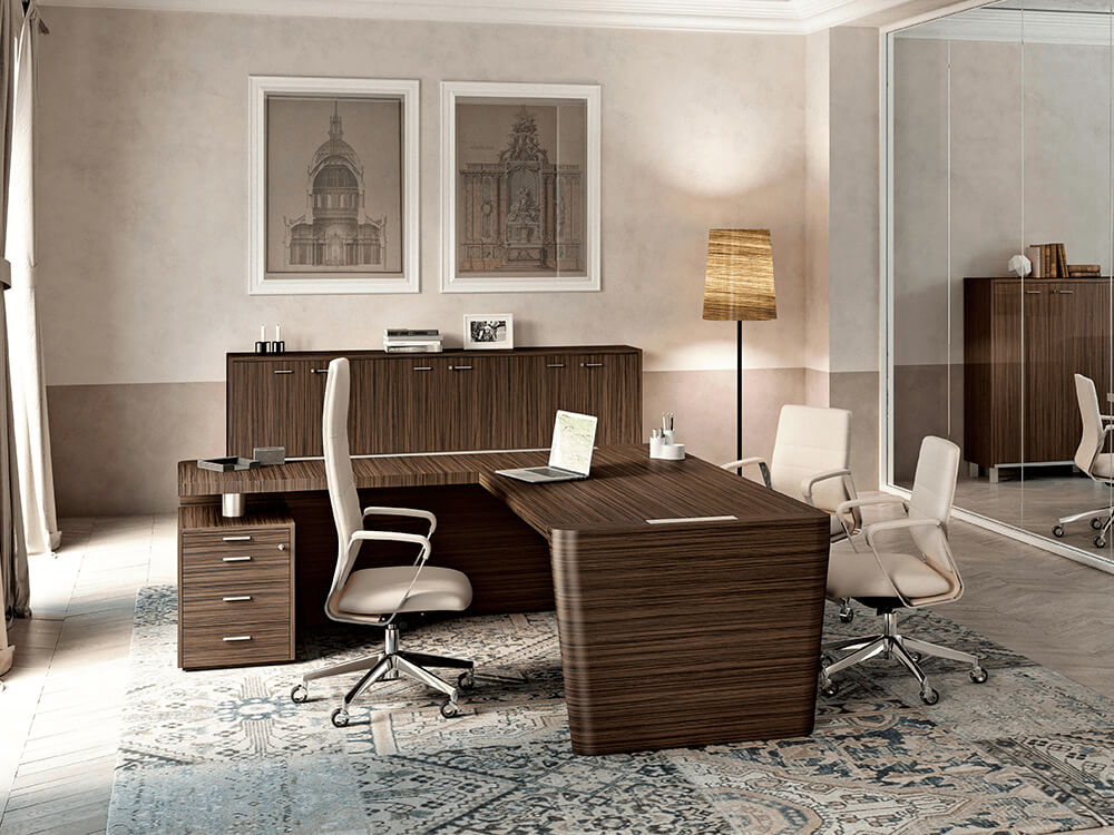 Desk: A sophisticated desk featuring an 18mm veneered MDF top with matching wood veneer edges with Optional Leather Inlay, complemented by a sturdy frame of epoxy-coated steel tubes. The desk includes a pedestal with 3 drawers and 1 pen drawer, both equipped with soft-close mechanisms and central locking. A matching modesty panel adds to the desk's clean, elegant design. Available in Elm, American Walnut, and Ebony finishes.