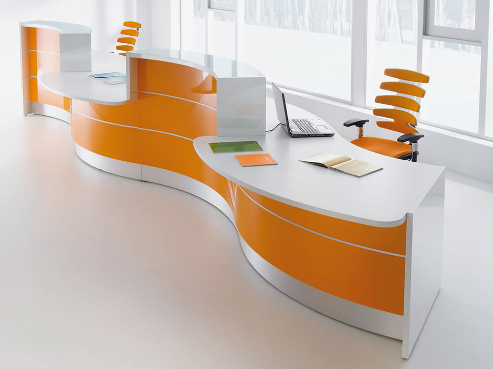 For ultimate modern but retro vibes, choose our large wave reception desk Lois. This bright workspace front can be customised in our high gloss colours of Burgundy, Green, Pink, Orange, or Yellow to bring a vivid element to your business. With varying levels of standing units and wheelchair accessible counters, this style adds to the already attractive wave design. Add a complementary colour of Grey or White worktops for added personality to your office colour scheme.