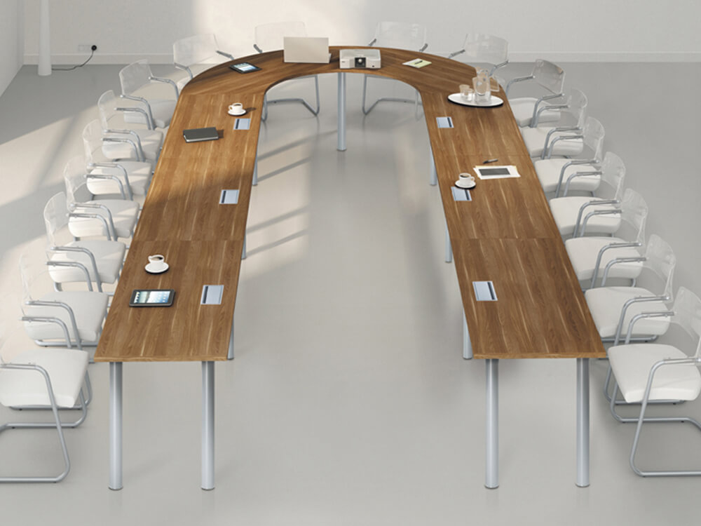 - Desktop: Melamine-covered particle board panels, 38 mm or 30 mm thick. 2 sides treated with an anti-reflective coating. Panel density 630 to 640 kg/m3. Flat edge banding (2 mm thick) made from a strip of glued ABS with rounded edges. Edge banding to match worktop finish, and Worktops with pre-drilled holes for cable ports or top-access modules