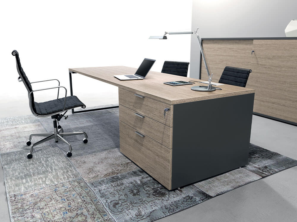 Italian quality and design for functional and modern spaces, the executive desk features elegant ring legs. The office desk is equipped with a drawer unit which has a hollow backspace to allow for cable wires to pass through. Choose from our wide selection of Italian melamine and epoxy finishes to complete the desk.