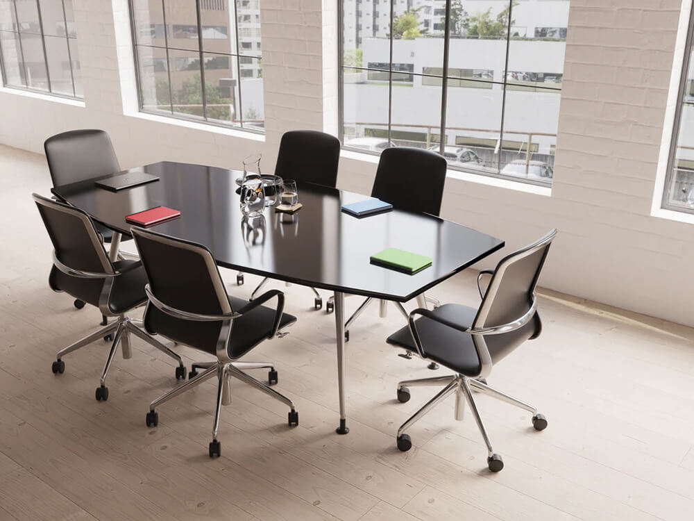 - Worktop: MFC 25mm thick tops with Elegant high gloss polished tops, Stylish tip to toe leg detail, Boat shaped for better teamwork, Height adjustments to feet, High sheen black finish, and writable surface that can be wiped clean