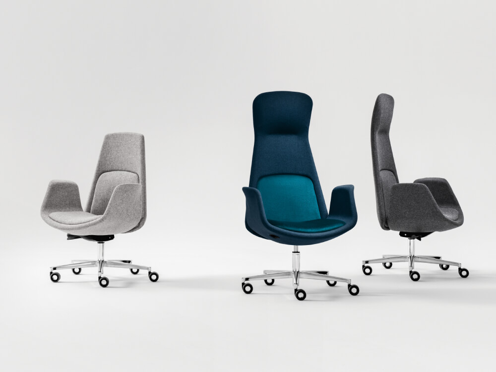 The armchair, which comes in leather or fabric and in a wide range of colours, is available in Medium and High backrest heights. A synchronised tilt mechanism can be incorporated into the frame.