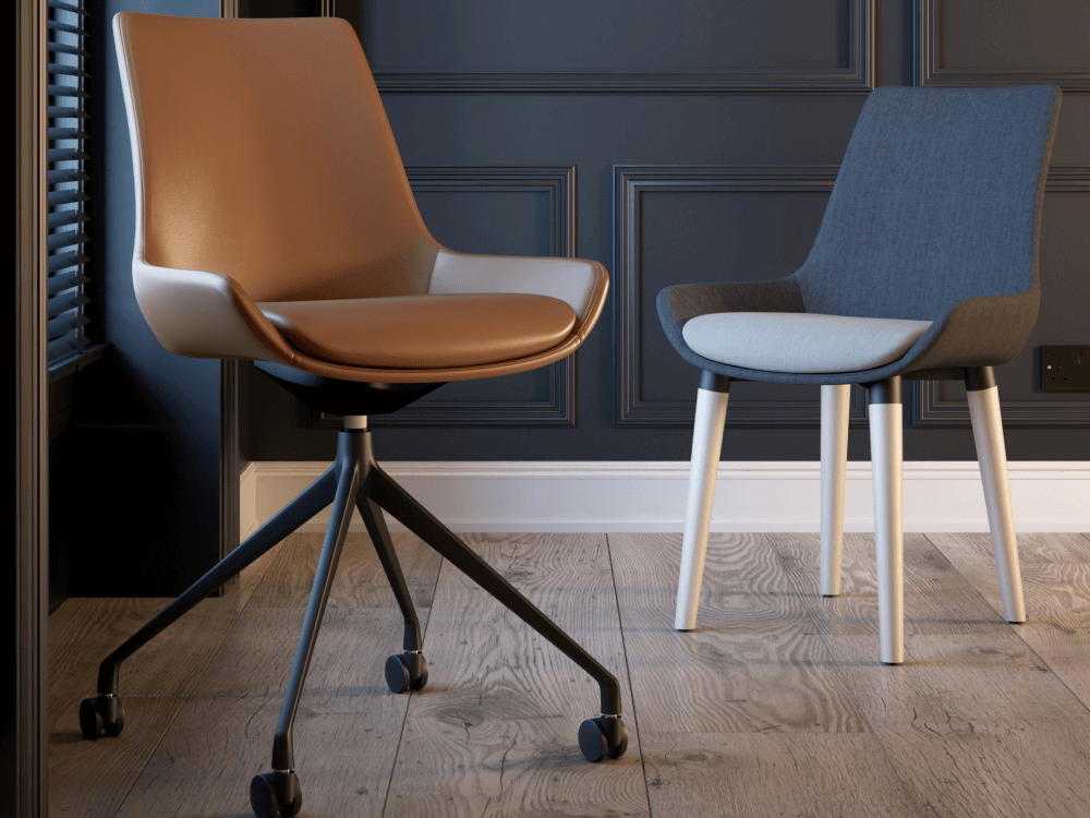 The design of Mesa presents an elegant and stylish multi-purpose chair, suitable for breakout spaces, leisure environments, meeting rooms, and boardrooms. Upholstered in your choice of fabric and leather, the seat is offered on a four-legged wooden base or a four-star aluminum base with castors or glides An integrated tilt mechanism is used with the four-star base to enhance the chair's functionality and comfort.