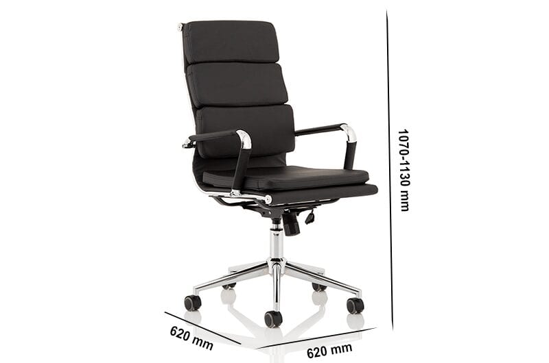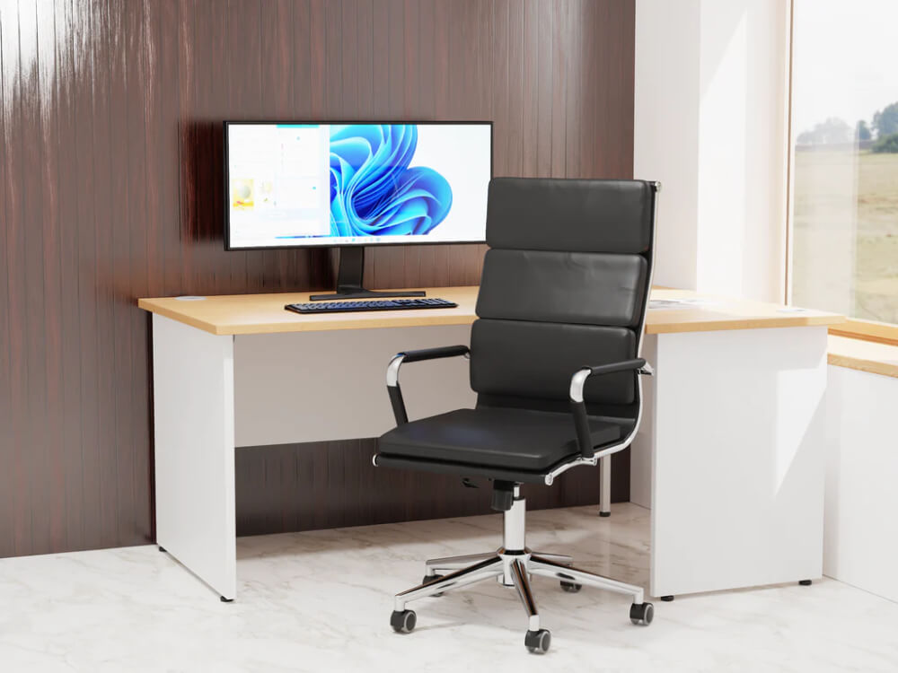 Inspired by the cities of Italy, our Milan chair is the fashion capital of Black leather executive chairs. The classic upholstered design is upgraded to offer three large padded cushions on the high curved back, to offer back support for long hours. Made from high-quality faux leather, it perfectly complements the Chrome wheeled base and matching armrests. This faux leather executive chair has integrated adjustable tension and tilt locking system to offer stability as well as the creative rocking mode.