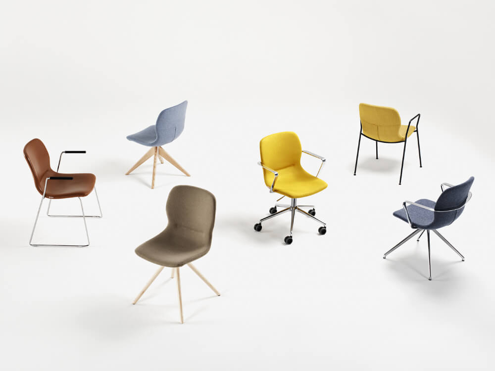 The Mirabella chair is a versatile piece designed to adapt to the fluidity of contemporary spaces. Its shapes are inspired by the human body, echoed in the profile of the single-piece upholstered shell that integrates seat and backrest for maximum comfort. The continuous line of the armrest, which wraps around the back and sides, stands out as a unique design feature.