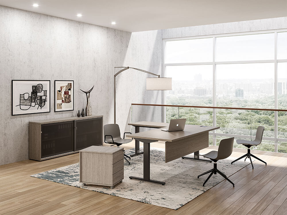 With several colour options for the wood and metal components, this executive desk is perfect for the modern work environment. It comes with an option of a hanging return and modesty panel. making it the perfect choice for today's modern office space.