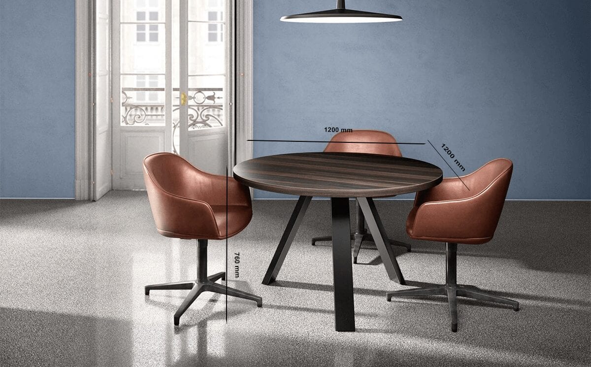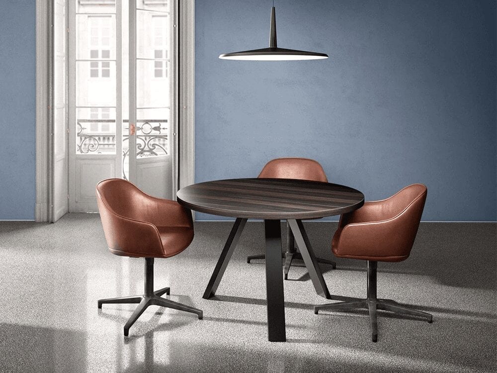 Our small meeting table will make a chic impact on your working area. Nora is a K-leg meeting table, designed to be both stylish and practical with its trio of legs. The combination of colours will complement each other from our decorative wood finishes to our two popular Black Jazz and White Dance leg finishes. Having a round meeting table is ideal for space-saving as well as quick chats with clients and staff members.