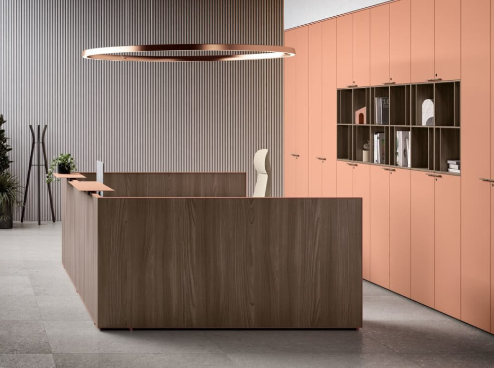 Your reception area is your company’s business card: it showcases your business’s identity and values a look of great exclusivity to entrances and reception areas. Our reception desks are designed to perform different functions: registering visitors, directing them to staff members, and providing information, all with first-rate ergonomics to make tasks easier.You can choose from the of various finish combinations, shape and functionality of your reception desk to best serve the needs of any type of business. Design, materials and aesthetic solutions combine to create a strong identity and impeccable style. Attention to detail is what makes the difference, ensuring every composition is both stylish, exclusive and functional.