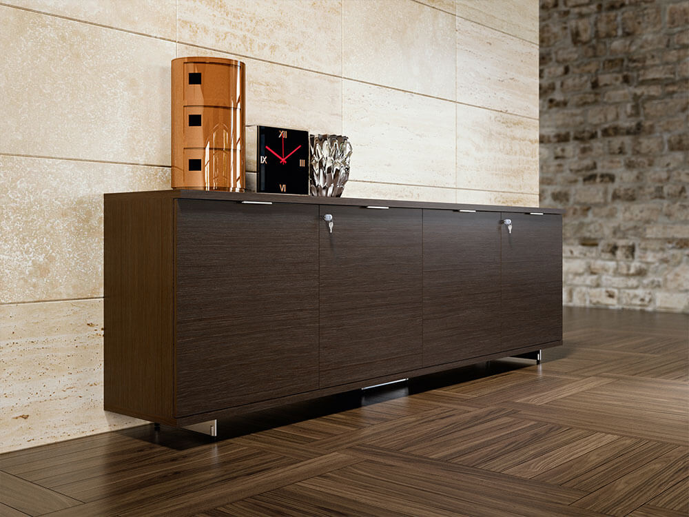 - Credenza: Credenzas are available in various sizes and types (with doors or with doors and open compartments) and sides, backs, and fronts are made of 18 mm thick panels. The top and bottom are 30 mm thick. The entire structure comes in melamine in all the available finishes - density 690 kg/mc, class 2 of reaction to fire and edged in ABS of 1 mm or pre-composed wood veneer and 1 mm wooden edging.