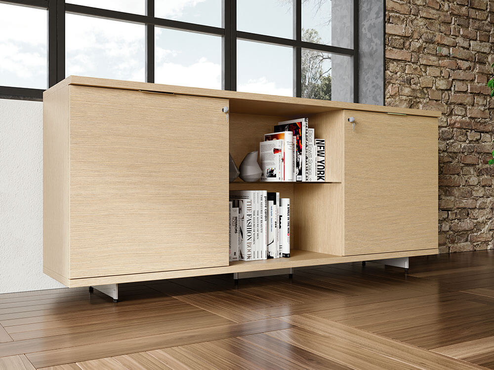 - Credenza: Credenzas are available in various sizes and types (with doors or with doors and open compartments) and sides, backs, and fronts are made of 18 mm thick panels. The top and bottom are 30 mm thick. The entire structure comes in melamine in all the available finishes - density 690 kg/mc, class 2 of reaction to fire and edged in ABS of 1 mm or pre-composed wood veneer and 1 mm wooden edging.