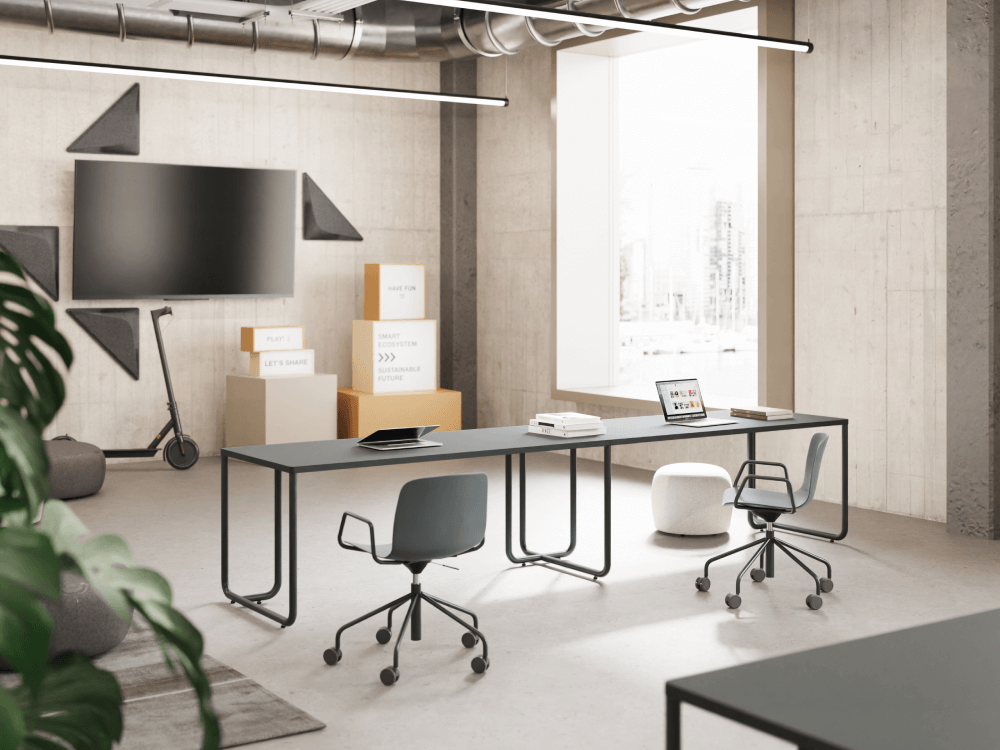 One of the proposals of this collection is the linear bench. Users can sit on the same side, making it suitable near windows or walls. Users can personalize their workstations, making them uniquely their own and tailoring them to their specific needs.