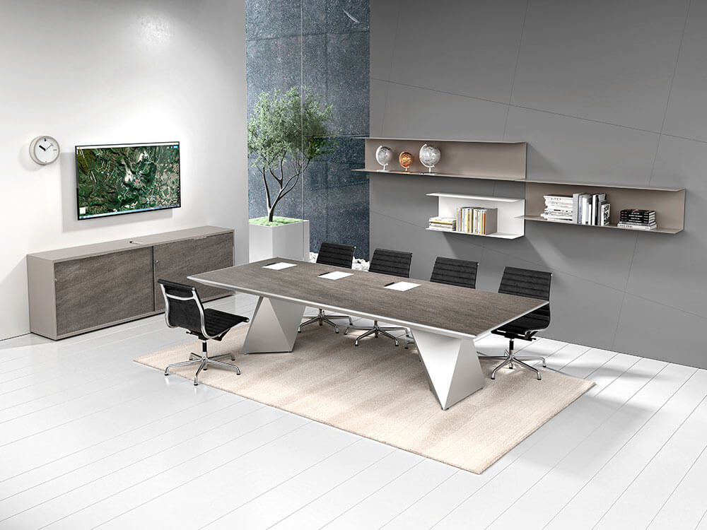 - Worktop: The desktop frame is in triangular section anodised extruded aluminium and measures 116x79.5 mm.18 mm thick melamine faced edged with 2 mm ABS.18 mm thick veneered with 2 mm wood edge; - melamine faced and covered in 2 mm leather with visible stitching; - 6 mm thick porcelain stoneware (backed by a 12 mm thick melamine-faced panel); - 8 mm thick extra clear glass, embossed with water-based paint on the lower part and if required with anti-fingerprint treatment on the upper part. The corner joints are in cast metal.