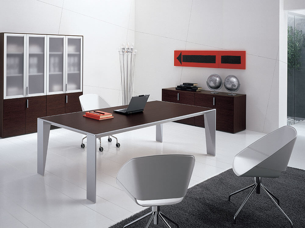 - Worktop: The desktop frame is in triangular section anodised extruded aluminium and measures 116x79.5 mm.18 mm thick melamine faced edged with 2 mm ABS.18 mm thick veneered with 2 mm wood edge; - melamine faced and covered in 2 mm leather with visible stitching; - 6 mm thick porcelain stoneware (backed by a 12 mm thick melamine-faced panel); - 8 mm thick extra clear glass, embossed with water-based paint on the lower part and if required with anti-fingerprint treatment on the upper part. The corner joints are in cast metal."