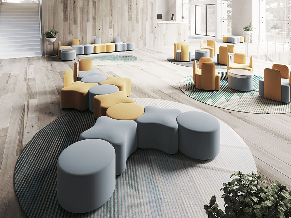 - Pouffe modular system composed of: Cylindrical element with support top, Shaped element, Shaped element with side supports. On antislip glides, in one-colour or two-colour version