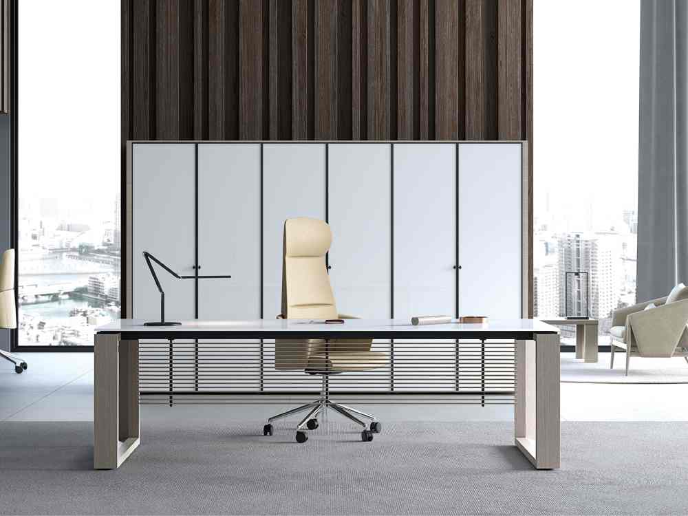 Ryder is an Italian designed modern executive desk made from 38 mm thick veneer top. A mix of tradition and modernity, with its timeless ring legs, this desk is a great choice for managers to give their office even more value. Attach a credenza unit to create more workspace and arrange your cables through a variety of cable management options.